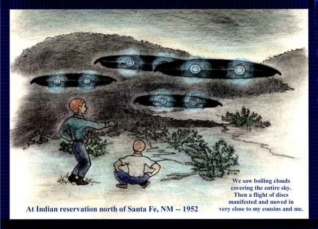 The summer of 1952 I worked on my aunt and uncle’s farm near Imperial, Nebraska. They had unusual success with their wheat crop that year and decided that we would take an extended trip to the southwest region of the United States. We had many UFO encounters along the way. When we were at an Indian reservation north of Santa Fe, New Mexico the two adults decided to have some drinks at a local reservation bar. (In those days bars were allowed on reservations.)