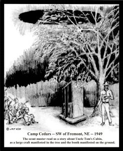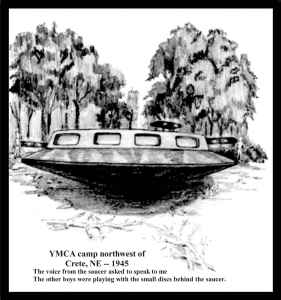 This occurred at a Boy Scout camp just before we boys and the disc-shaped crafts with headlights played a game of tag in an adjacent field. The boys got crazy/excited. However, I can’t recall for sure if any of them were knocked to the ground. After I watched this for a time, I tried to chase a disc, but the disc turned and moved very slowly up in front of me, the voice espousing one of the usual routine calm messages. We all then began running, completely out of control toward our campsite…south of the Platte River south of Fremont, Nebraska, August 1949. Read the rest of the story in Eminent Discovery Volume 1.