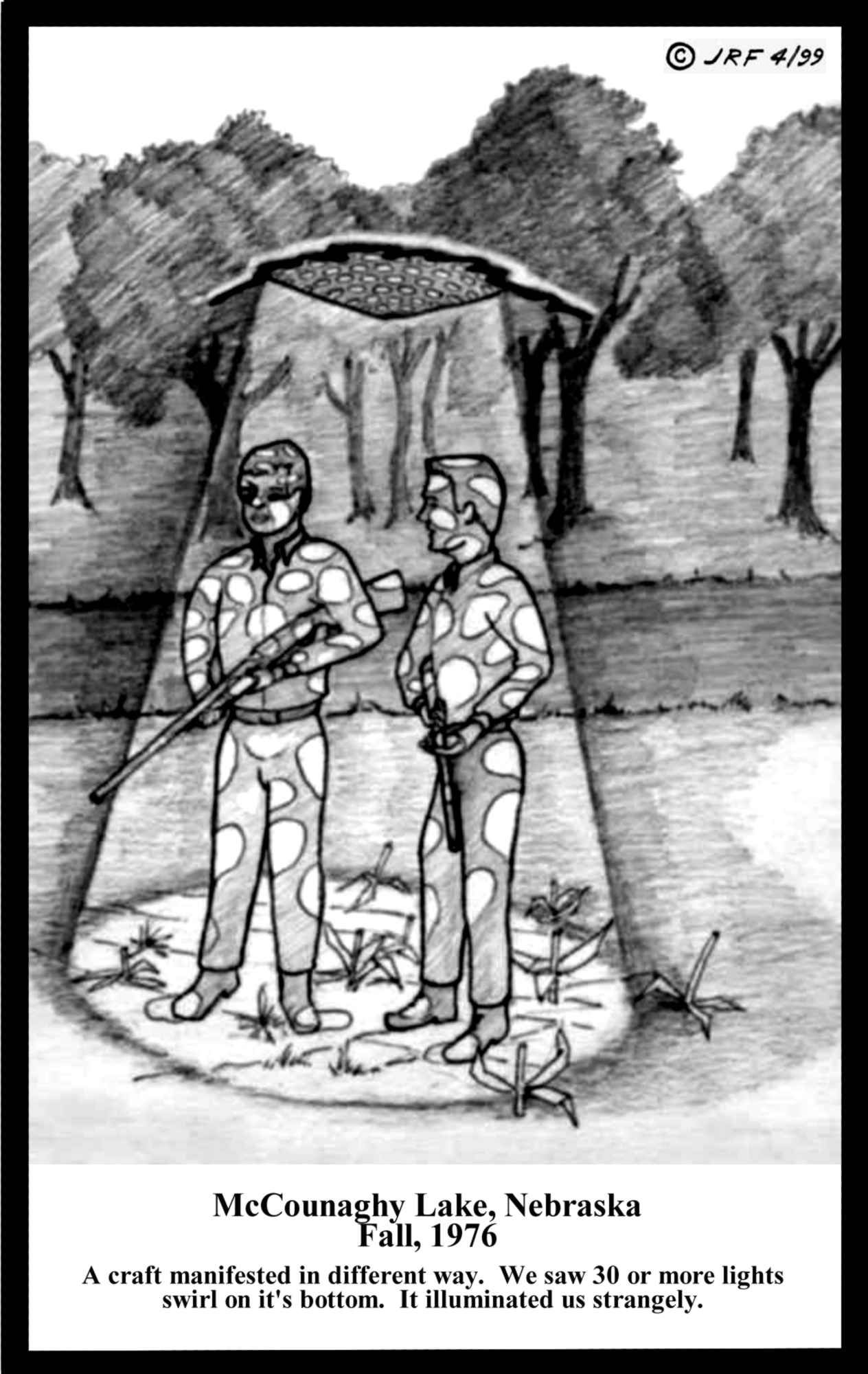 Hunting with my brother-in-law in the mid 1970s, I witnessed a different visual effect. First, the light shown down on my brother-in-law and another fellow who hunted with us. Then, the light shown down on me. This time, more than one light was involved. Twenty or more very small spotlights flashed and swirled on the bottom of a small craft that hovered about five feet above us. The mysterious light made all of us appear completely unusual. I don’t know exactly how I looked, but the nature of the lights seemed so peculiar it transformed my two companions into a whirling speckled array of radiance. During recollection, I presumed the intelligence behind all of this wanted us to remember this particular day – for what reason, I couldn’t really say. Sometimes, I wondered if all of these luminous occasions might have been symbolic communication intended to convey my dire need of enlightenment.