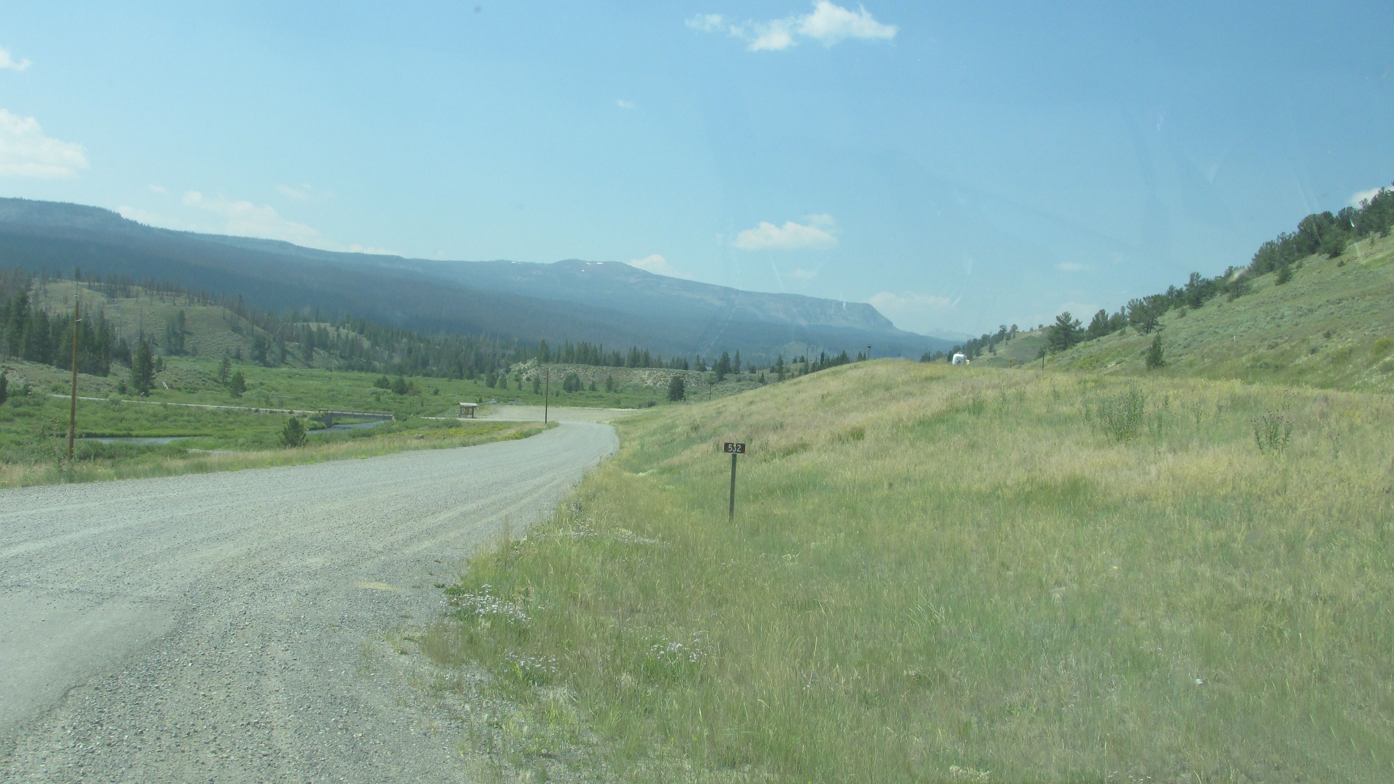 Looking west southwest… Highway 287 turnoff road to Sheridan Creek & Sheridan Creek Fireguard Cabin…about 11 miles west of Dubois, Wyoming. Hwy 287 is up to the right. The location of the future 5 story building to be used in the future project is off the road to the left.