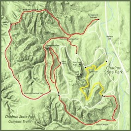 We also had encounters on the Federal land on the left…and on and near the bluff across the highway from the park entrance…beyond the right edge of the map. My wife witnessed a half-moon shaped light/craft as we were looking at the landscape at the black dot on the upper part of the red trail on the left. And we both saw UFO lights out of the back windows of my old van as we were preparing to sleep…near the black dot on the federal land.