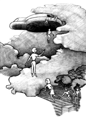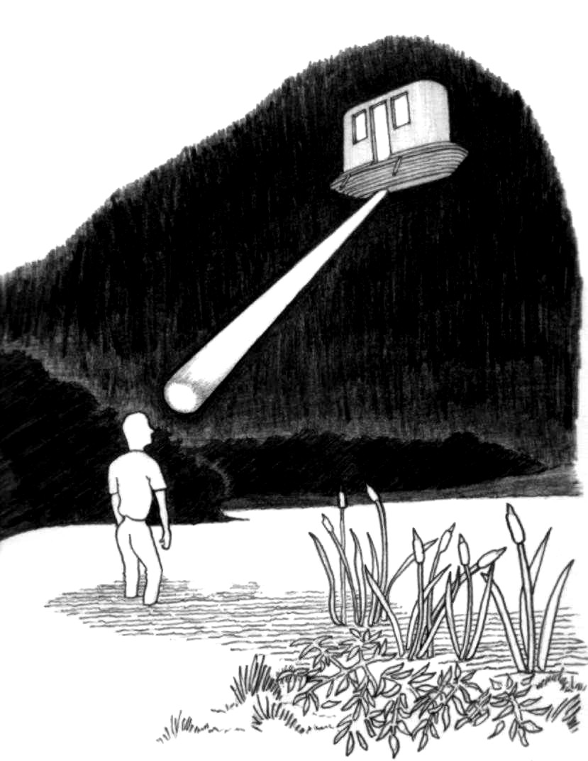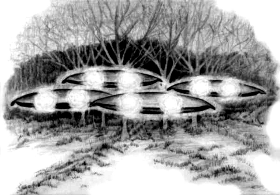 Comparing the manifestations of the crafts above with my experiences, comparing other humans’ experiences while riding in the crafts, and considering other pertinent things, I believe that we, when on the ground, were not seeing more than one craft but simply one craft that was appearing, hovering, moving, disappearing and reappearing, etc. We were seeing all versions of the same craft at the same time as we normally perceive time and space. This suggests that the crafts and at times the beings we saw and interacted with (those that existed at that time in our time and space) were in another time/space continuum that somehow overlapped our current time/space. Seeing the craft at different locations at what seemed to be the same time indicates that our time/location of observation was somehow linked to some of their individual times/locations…or it possibly was a higher time/space that intersected in a multiple way in our space at our then current time. The landscape appeared to stay completely the same throughout these strange experience sequences.