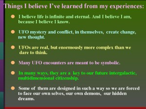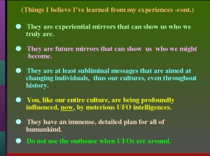 After several years of reflection, just before I began to give some talks to interested groups and UFO conferences across the country, I wrote down some of my temporary thoughts and conclusions. This was in the 1990s. The following are slides that I used at the end of those talks, especially as the Keynote Speaker at the 2000 Ozark UFO Conference in Eureka Springs, Arkansas.